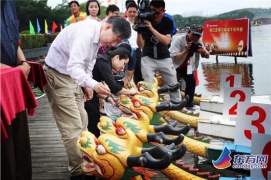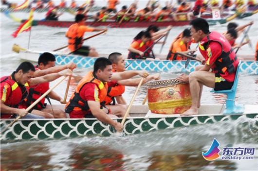 东方网记者徐群立6月9日报道:农历五月初五,是一年一度的“端午节”,这一天,各地的人民群众除了食用粽子的风俗以外,还有一种十分盛行的比赛——龙舟赛。今天上午,上海市第二届市民运动会龙舟比赛暨松江区第八届端午龙舟赛在松江华亭湖隆重举行。