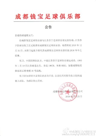 6月22日,中乙俱乐部成都钱宝官方宣布,苏宁球员张卫租借加盟,租借期至2016年12月31日。