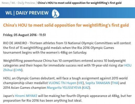 但是在今天里约奥运官方信息中,她却“复活”了,依然被组委会称为里约奥运会媒体官方信心系统R认定为是“中国队稳定的首金争夺者”。信息中还指出,她的主要对手为2015年世锦赛银牌得主越南选手王氏玄、泰国选手索匹他。