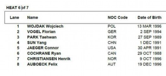 以赛道安排情况来看,备受关注的孙杨被分在第6组的第四道,韩国选手朴泰桓赛道则紧挨着孙杨,他将在第三赛道出战。同组的还有上届奥运会银牌得主加拿大选手科克兰。此外,澳大利亚天才霍顿则被分在第7组的第四道。