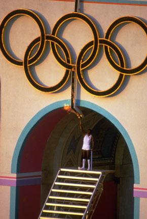 一名马拉松运动员、一名教师和一名舞蹈演员共同点燃火炬塔,体现了奥运的全民参与。点火人数也在当时创了一项奥运会“纪录”。
