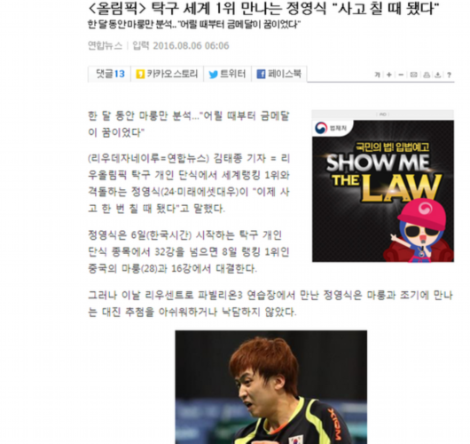 韩国《联合新闻》网站报道称,韩国男乒运动员有可能在男单十六强淘汰赛中遭遇世界排名第一的中国选手。