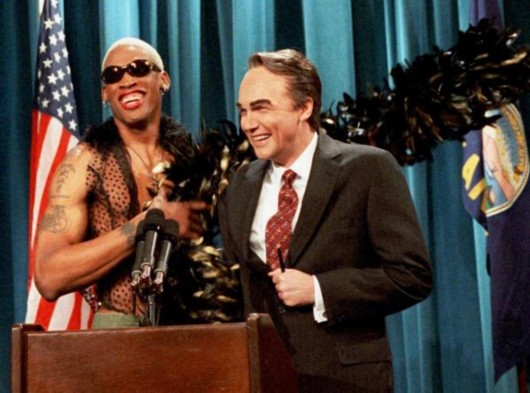 罗德曼裸着上身参加《周六夜现场》节目。当晚,他还在另一个节目《周末更新》中,在椅子后全裸出镜。