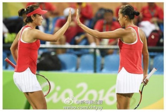 《女双:彭帅/张帅晋级》8月6日,彭帅/张帅(右)在比赛中相互鼓励。当日,在2016年里约奥运会网球女双首轮比赛中,中国选手彭帅/张帅以2比1战胜印度选手米尔扎/托巴雷,顺利晋级。新华社记者刘杰摄