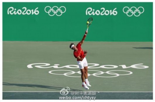 # #《下一轮》 8月9日,纳达尔在比赛中发球。当日,在巴西里约热内卢进行的2016年里约奥运会网球男子单打第二轮比赛中,西班牙选手纳达尔以2比0战胜意大利选手塞皮,晋级下一轮。 新华社记者韩岩摄
