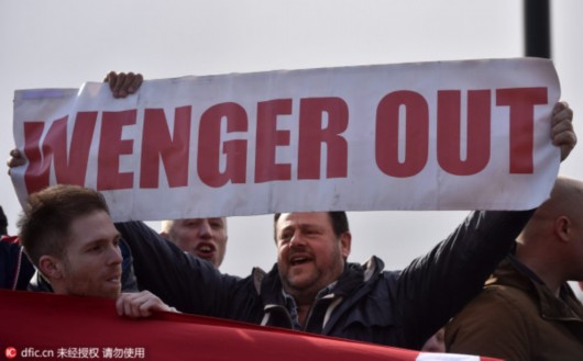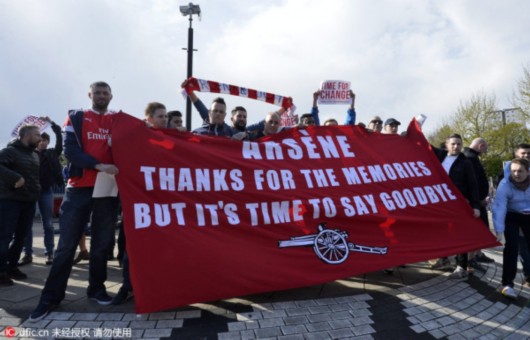 当地时间2016年4月30日,英国伦敦,15/16赛季英超第36轮,阿森纳VS诺维奇。阿森纳球迷忍无可忍,赛前高举标语高呼温格下课。