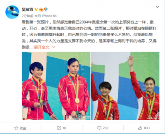 “看到第一张照片,忽然感觉像自己2004年奥运会第一次站上领奖台上一样,激动,开心,甚至用表情表示我当时的心情。然而第二张照片,那时眼泪在眼眶打转,因为看着国旗升起时,自己想到这一刻的到来是多么不易的。但我最后想说,其实我一个人的力量是支撑不到今天的,是国家和上海对于我的培养,又得到很多工作人员的帮助,才让我能坚持到今天,实现梦想的突破。做为中国队的一员,我感到骄傲!通过微博向大家说声谢谢,你们辛苦了!”吴敏霞在微博里写到,并贴出了自己在领奖台上的照片。