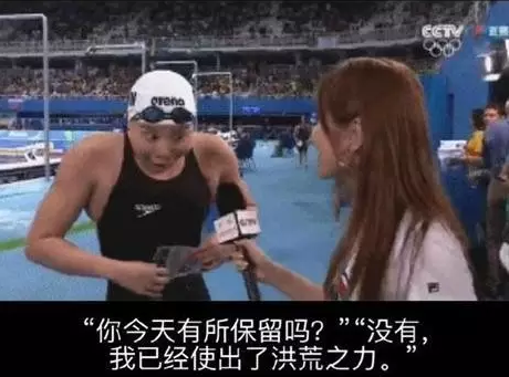 是没有任何包装,没有任何色素,没有任何人工肥料、杀虫剂、除草剂的真正有机绿色的人话。当记者告诉她游了58秒95时,她惊呼:我能游这么快?记者问:有没有为明天的比赛有所保留?她回答:没有保留,我已经用了洪荒之力啦!记者追问:是不是对明天决赛充满希望?她的回答更令人意外:没有,我已经很满意了,我对半决赛的成绩非常满意!
