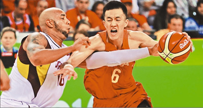 中国男篮主力后卫郭艾伦在比赛中突破。