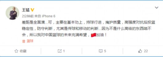 “差距是全面滴...可,主要在基本功上,持球行进,掩护质量,高强度对抗后投篮稳定性,防守判断,尤其是传球和移动的判断...因为不是什么高级的东西咱不会,所以我对中国篮球的未来充满希望,加油!”至少从这场比赛来说,中国篮球还是让人们看到了希望。