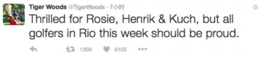 比赛结束后,老虎很快发推特向这些英雄们致敬,不只是向获得奖牌的球员,而是所有参加奥运会的球员:“为罗斯、亨利克和库查尔感到兴奋,但本周所有里约的高尔夫球员们都是光荣的。”