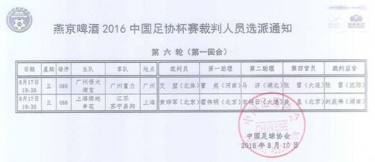 新浪体育讯北京时间8月17日19:35分,2016年中国足协杯第六轮(半决赛)第一回合的两场焦点大战即将打响。日前,中国足协官网公布这两场焦点战的裁判员选派通知,广州恒大淘宝迎战广州富力的同城德比将由艾堃执法,江苏苏宁客战上海申花的“长三角德比”则将由黄烨军负责吹罚,具体信息如下: