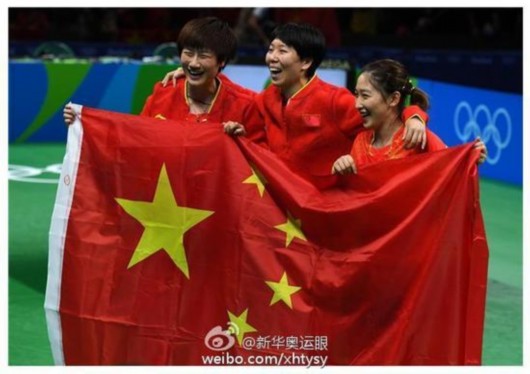# 里约奥运会 #《:》 8月16日,中国队选手丁宁(左)、李晓霞(中)和刘诗雯庆祝获胜。当日,在2016年里约奥运会乒乓球女子团体赛决赛中,中国队以3比0战胜德国队获得金牌。 新华社记者 殷博古 摄