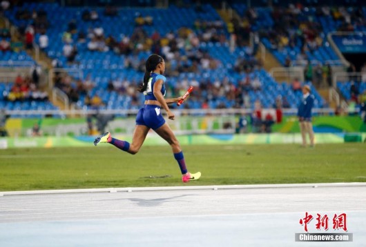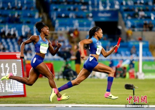 当地时间8月18日,2016里约奥运会女子4X100米预赛的重赛中,美国队独自完成了比赛,成绩为41秒77超越中国队。这样,中国队无缘该项目决赛。据悉,由于美国队在当日上午的预赛中受到巴西队干扰,未能顺利完成比赛,事后美国队申诉得到国际田联支持,获得重赛资格。中新网记者杜洋摄