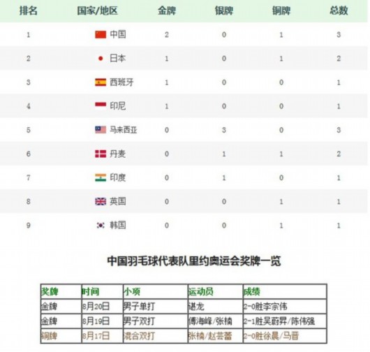 人民网8月21日北京电(杨丽娜)北京时间8月21日上午,2016年奥运会类项目所有比赛落下帷幕。在这10天的赛程里共产生了5枚金牌,其中中国囊括2金1铜领先,日本摘得1金1银紧随其后,西班牙、印度尼西亚以一枚金牌并列第三。