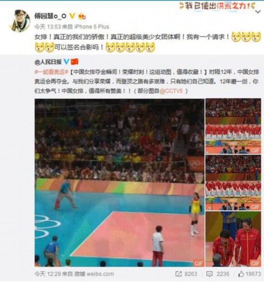 已经回家休息的傅园慧转发了人民日报的一条战报微博,并表示中国女排才是超级美少女团体。“女排!真正的我们的骄傲!真正的超级美少女团体啊!我有一个请求!可以签名合影吗!”傅园慧说。