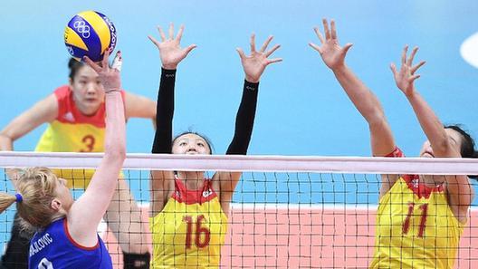 8月20日,中国队球员丁霞(右二)在比赛中拦网。 当日,在2016年里约奥运会女子排球决赛中,中国队对阵塞尔维亚队。 新华社记者王鹏摄