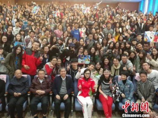 当日上午,吴敏霞、傅园慧一行刚一下车,就受到一群暨大学生粉丝的热情欢迎,大家纷纷上前请求合影留念。