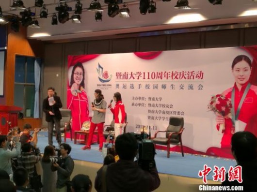 中新网广州11月11日电 (记者 郭军)应暨南大学校友总会会长马有恒的邀请,奥运跳水冠军吴敏霞、“洪荒少女”傅园慧11日来到广州暨南大学南校区,在校友林种树,并与学生互动交流,共贺暨大110周年校庆。