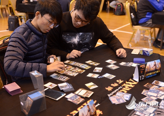 图片说明:同一个参赛队的两名队员正在赛前对手中持有的卡牌进行“战略调整”。