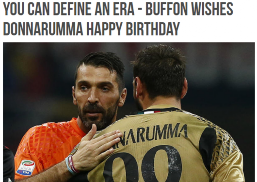 作为16岁就出战意甲的天才门将,多纳鲁马被广泛的认为是布冯的接班人。出生于1999年2月25日的多纳鲁马迎来了18岁生日,而这位意大利希望之星收获一份来自模范前辈布冯的大礼。