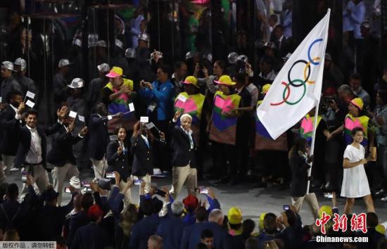 图片说明:当地时间8月5日晚8时,2016里约奥运会开幕式在里约热内卢马拉卡纳体育场举行,难民代表团入场。