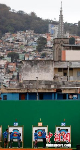 图片说明:里约马拉卡纳赛区的桑巴大道,射箭选手在训练中。盛佳鹏 摄