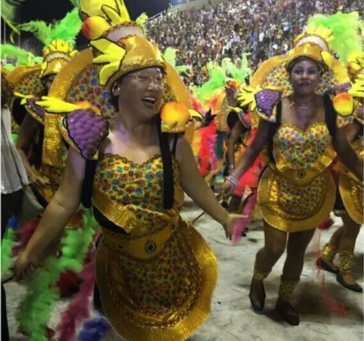 今年初来巴西看望女儿时,陈菁在桑巴大道上参观了一次桑巴学校彩排后,她惊讶地发现,巴西狂欢节的桑巴更注重全民参与、全民娱乐,对技术和竞技性要求并不高。于是在支付了500雷亚尔(约合842元人民币)的服装费后,陈菁如愿参加到该校的里约狂欢节甲级非专业表演方阵中。