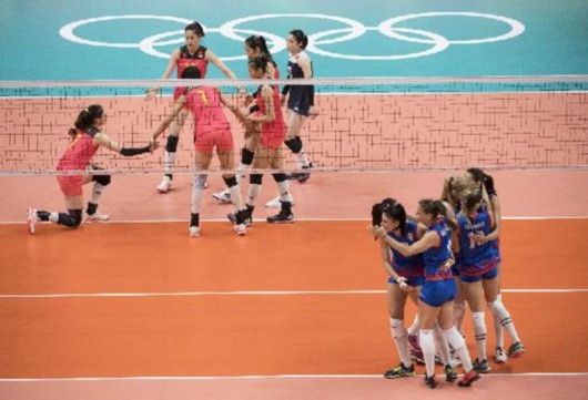 8月12日,塞尔维亚队球员(右)在比赛中庆祝得分。 当日,在2016年里约奥运会女子排球小组赛中,中国队以0比3不敌塞尔维亚队。新华社记者吕小炜摄